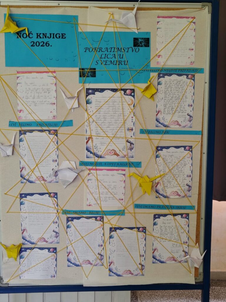 Povodom Noći knjige s učenicima sedmih razreda na satu Hrvatskog jezika u suradnji sa školskom knjižničarkom obradili smo temu “Pobratimstvo lica u sveMIRu”, inspiriranu stihovima Tina Ujevića. Naglasak je bio na miru, zajedništvu, empatiji i razumijevanju.